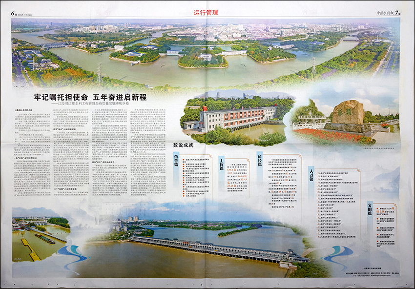 □董晶晶 高宇朦 刘昊 这里是南水北调东线工程的源头,被誉为“江淮明珠”;这里是目前我国规模最大的电力排灌工程、亚洲最大的泵站枢纽。 从高空俯瞰,这里就如一架精密运转的“水脉中枢”——4座抽水站的运行、19座涵闸的启闭,事关水体的流向走势、人民生命财产安全和经济社会高质量发展。 这里就是位于江苏省扬州市的江都水利枢纽。 古有李冰都江堰,今有人民江都站。 2020年11月13日,习近平总书记来到这里,详细了解江都水利枢纽发展建设历程和发挥调水、排涝、泄洪、通航、改善生态环境等功能情况。 5年来,作为江都水利枢纽的运行管理单位——江苏省江都水利工程管理处(以下简称“管理处”),始终牢记嘱托奋勇向前,紧扣主责、创新突破、筑牢根基,全力推动各项工作高质量发展走在前、做示范,每一步都铿锵有力。 一条“主线”,紧扣主责主业 防汛抗旱和水资源南北调配,这既是江都水利枢纽的主责主业,更是其不折不扣落实习近平总书记关于治水重要论述特别是关于南水北调和国家水网建设的重要讲话指示批示精神的具体行动。 5年来,管理处以“精细化、标准化、智能化”为导向,将殷殷嘱托转化为守护流域安澜的实际行动,在防汛抗旱、工程管护、安全保障等核心领域深耕细作,交出了一份沉甸甸的辉煌答卷——先后斩获“中国质量奖提名奖”“中国水利工程优质(大禹)奖”“人民治水·百年功绩”治水工程项目等荣誉,4座泵站、4座水闸工程高分通过水利部标准化管理评价,江都泵站获评中国灌区协会“标准化管理示范泵站”,以标杆之力彰显南水北调东线源头工程的责任担当。 5年来,管理处始终扛牢“调水保供、防洪排涝”核心使命,抽引江水353.9亿立方米,排泄淮河洪水670.6亿立方米,抽排涝水28.28亿立方米,为流域防洪安全、供水安全、粮食安全、生态安全提供坚实保障。 面对极端考验,管理处勇毅前行,成功应对2022年至2023年夏秋冬春四季连旱,从容抵御“烟花”“贝碧嘉”等多次强台风侵袭,高效应对多轮连续强降雨,圆满完成236项上级调度任务,充分彰显了工程防灾减灾与民生保障效益。 两项“重点”,开拓创新赋能 人才与科技,是事业发展的基础和保障。管理处锚定“强才工程”与“科技兴水”两大重点,激发高质量发展的内生动力。 5年来,管理处聚焦人才强处战略,科学制定人才队伍建设规划,以“英才工程”“头雁工程”“拔尖工程”为牵引,依托全国水利行业首席技师工作室、水利部闸站运维管理人才培养基地、江苏技能大师工作室、江苏工匠学院、劳模创新工作室等国家级、省级平台,推动人才力量向技能竞赛、技术攻关、科技成果转化一线集聚;助推“产学研”协同育人,创新“传帮带”培养路径,让年轻人才在防汛抗旱、代管运行、技术服务等实战场景中淬炼成长,为管理处长远发展积蓄人才底气。 5年来,管理处持续深耕水利科技创新,在智能泵站、智能水闸、标准制定、精密监测、成果孵化等方面实现全方位突破,“大型轴流泵站高效安全关键技术及应用”项目获教育部高等学校科学研究优秀成果奖(科学技术)二等奖;江都水利枢纽数字泵站获评“数字江苏建设优秀实践成果”;“自主可控的大型泵站、水闸计算机监控系统”入围工业和信息化部“2024年信息技术应用创新典型解决方案”;牵头编制泵站与水工闸门运行工系列教材3套,科技创新“含金量”持续攀升,成为江苏水利科技创新领域“排头兵”。 三个“保障”,力促改革发展 管理处聚焦保效能汇合力,保安澜筑屏障,保安全守底线,助推江苏高质量发展走在前列。 5年来,管理处强化效能保障,锚定中心工作,分解重点任务,建立“月督办、季督促、年督查”闭环落实机制,确保中枢运转高效顺畅;深化财务管理改革,严格落实部门预算和零基预算管理要求;圆满完成“十四五”规划目标,科学谋划“十五五”发展蓝图,为水利事业持续发展提供坚实保障。 5年来,管理处强化河湖安澜保障,持续深化河湖管理与水政执法工作,以“零容忍”态度严控“四乱”(乱占、乱采、乱堆、乱建)问题,规范水事秩序、涵养水域生态,累计完成“两河两湖”动态遥感核查641处并组织抽查复核,动态掌握省重点河湖库空间变化情况,推动新增问题及时整改销号,为南水北调东线工程输水安全和流域高质量发展保驾护航。 5年来,管理处强化安全保障,常态化实施水利安全生产风险管控“六项机制”,以“十项安全规范”为准则、“十项排查整改”为闭环,坚持“月例会、月研判、月通报、月部署”机制,全面贯彻安全生产“六化”管理新要求,系统编制并动态完善“事项、风险、责任、措施”四个清单,全覆盖推行安全管理“一岗一页”,确保责任链条可追溯、管控措施可操作。 四张“名片”,擦亮品牌底色 管理处在“十四五”期间重点打造党建引领、对外服务、源头文化、文明创建四张“名片”,持续提升行业影响力。 5年来,管理处紧扣新时代党的建设总要求,实施高质量发展“铸魂”“夯基”工程。扎实推进模范机关建设,健全中心组学习“六个一”机制,实施“五个讲坛”质量提升行动,构建青年学堂“五青”学习矩阵,获评江苏省“省级机关模范机关建设标兵单位”。开展“牢记嘱托担使命、示范表率当先锋”实践活动和“揭榜领题”攻坚行动,推动党建与中心