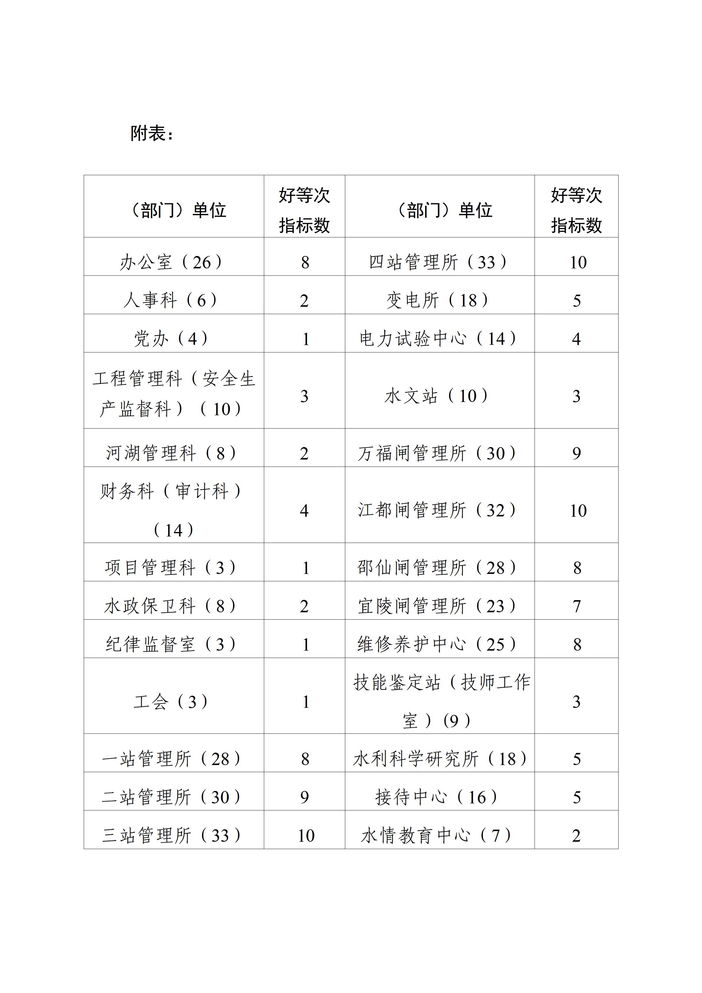 处各部门、处属各单位: 根据《江苏省江都水利工程管理处干部职工平时考核实施办法(试行)》(苏水江人〔2025〕17 号),现将 2026 年第一季度干部职工平时考核工作通知如下: 一、组织领导 组 长:钱邦永 副组长:张桂荣 王雪芳 张 宇 钱利华 朱建军 二、考核对象 处科级及以下干部职工。 三、考核时间 3 月下旬起现场考核,听取干部职工汇报述职,具体时间由各考核组统筹安排、提前通知。4 月上旬确定考核等次。 四、考核内容 干部职工第一季度工作完成情况。 五、分组情况 组成 6 个考核小组,每组由 1 名处领导带队,分工如下: 1.第一考核小组 组 长:钱邦永 联络人:顾 芸 考核单位:第四抽水站管理所、万福闸管理所 2.第二考核小组 组 长:张桂荣 联络人:严 爽 考核单位:办公室、河湖管理科、水政保卫科 3.第三考核小组 组 长:王雪芳 联络人:俞国兵 考核单位:项目管理科、工会、维修养护中心、接待中心、水情教育中心 4.第四考核小组 组 长 : 张 宇 联络人:陈 丹 考核单位:财务科(审计科)、第一抽水站管理所、第二抽水站管理所、第三抽水站管理所、变电所、电力试验中心 5.第五考核小组 组 长:钱利华 联络人:江如春 考核单位:工程管理科(安全生产监督科)、水文站、江都闸管理所、邵仙闸管理所、宜陵闸管理所、水利科学研究所 6.第六考核小组 组 长:朱建军 联络人:董晶晶 考核单位:人事科、党办、纪律监督室、技能鉴定站(技师工作室) 六、考核程序 (一)个人小结 1.各部门(单位)主要负责人于 3 月 31 日前将填写好的《平时考核登记表》报送至人事科黄文韬处(61873), 由人事科复印分发给处领导。 2.其他干部职工将填写好的《平时考核登记表》报各部门(单位)主要负责人,现场考核时由各部门(单位)复印报各考核小组组长。 (二)现场考核 1.工作汇报 各部门(单位)干部职工逐一汇报第一季度工作完成情况。 2.各部门(单位)主要负责人点评(见人见事),各考核小组组长讲话。 3. 民主测评 部门(单位)主要负责人考核由处领导对其进行测评。 其他干部职工考核在所在部门(单位)范围内进行测评(干部职工平时考核民主评议表见《江苏省江都水利工程管理处干部职工平时考核实施办法(试行)》附件2)。 (三)确定考核等次 1.各部门(单位)主要负责人测评结果由人事科统计汇总后,报处主要领导审核初拟考核等次;其他干部职工测评结果由各考核组联络人统计汇总后报人事科,人事科反馈给各部门(单位)主要负责人,由主要负责人结合测评情况提出等次建议,报分管处领导审核初拟考核等次。 2.处党委会议研究确定考核等次。 3.评定为“好”等次的干部职工公示5 个工作日。 (四)结果反馈 考核责任人采取适当方式,于 4 月中旬向干部职工本人反馈考核结果,肯定成绩、指出不足,提出改进要求,听取本人意见。 七、有关要求 1.各部门(单位)干部职工要高度重视,认真梳理总结第一季度工作完成情况,并严格把握时间节点,确保考核工作扎实高效开展。 2.“好”等次干部职工人数具体名额分配见附表。 人事科 2026 年 3 月 23 日 |